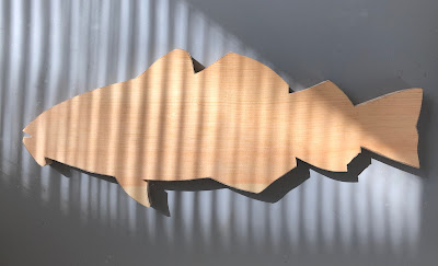 On Sunday, I picked up my pre-cut "codfish blank" in Marblehead. I am going to decorate it for the annual "Codfish Auction" to benefit Marblehead Festival of the Arts. This year I plan to decorate my codfish with the black-and-white stone wave pattern seen on the promenade of Copacabana beach. I always name my codfish project, and this year, I am going to call her "Rio Rita, Brazilian Bacalhau." That's the plan, but right now, the codfish blank is still really just blank. All I have done so far is sand the edges. But here is "Rio Rita to Be," sitting in the sun. I liked the shadows cast by the window blinds, so I took this picture.